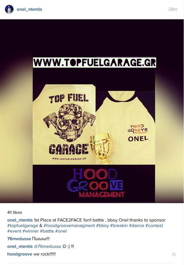 *Ευχαριστούμε τον συνεργάτης μας Top Fuel Garage (Συνεργείο, Ανταλλακτικά, Βελτιώσεις / Κλεισθένους 203, Γέρακας) για την υποστήριξη του! Όσοι πάνε στο κατάστημα και αναφέρουν ότι είναι μέσω των χορευτών Zoob ή Onel ή από την Hood Groove Management, θα έχουν 20% έκπτωση στα ανταλλακτικά.