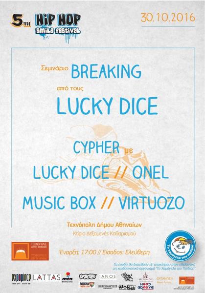 Συνεργαστήκαμε και στηρίξαμε την διοργάνωση του 5ου Hip Hop Smile Festival που γίνεται κάθε χρόνο για το Χαμόγελο του Παιδιού, Όπου την τελευταία μέρα πραγματοποιήσαμε σαν Hood Groove Management μαζί με την ομάδα των Lucky Dice ένα 3ωρο σεμινάριο breaking.